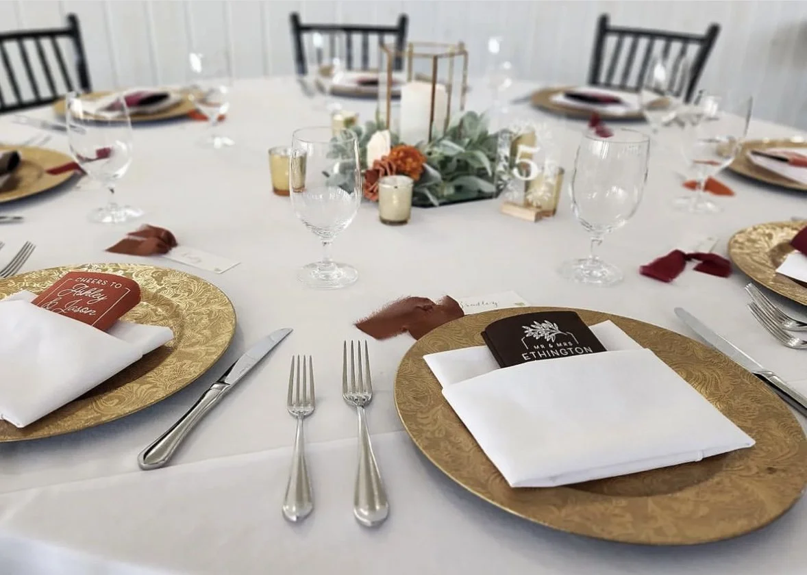 Set for a formal event with gold chargers, white napkins, and place cards. Centerpiece with candles and greenery decorates a round table with black chairs.